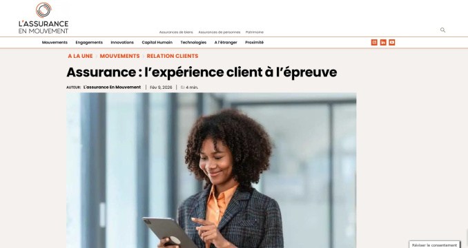 Dans un récent article, L’Assurance en Mouvement met en lumière les transformations profondes de l’expérience client dans l’assurance. Un constat directement issu de l’étude 2026 "Assurances, mutuelles – Expérience client & nouveaux services numériques", réalisée avec notre partenaire Innovation Assurance / Next Content.